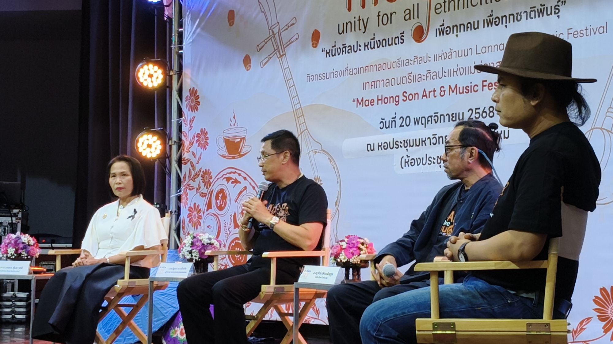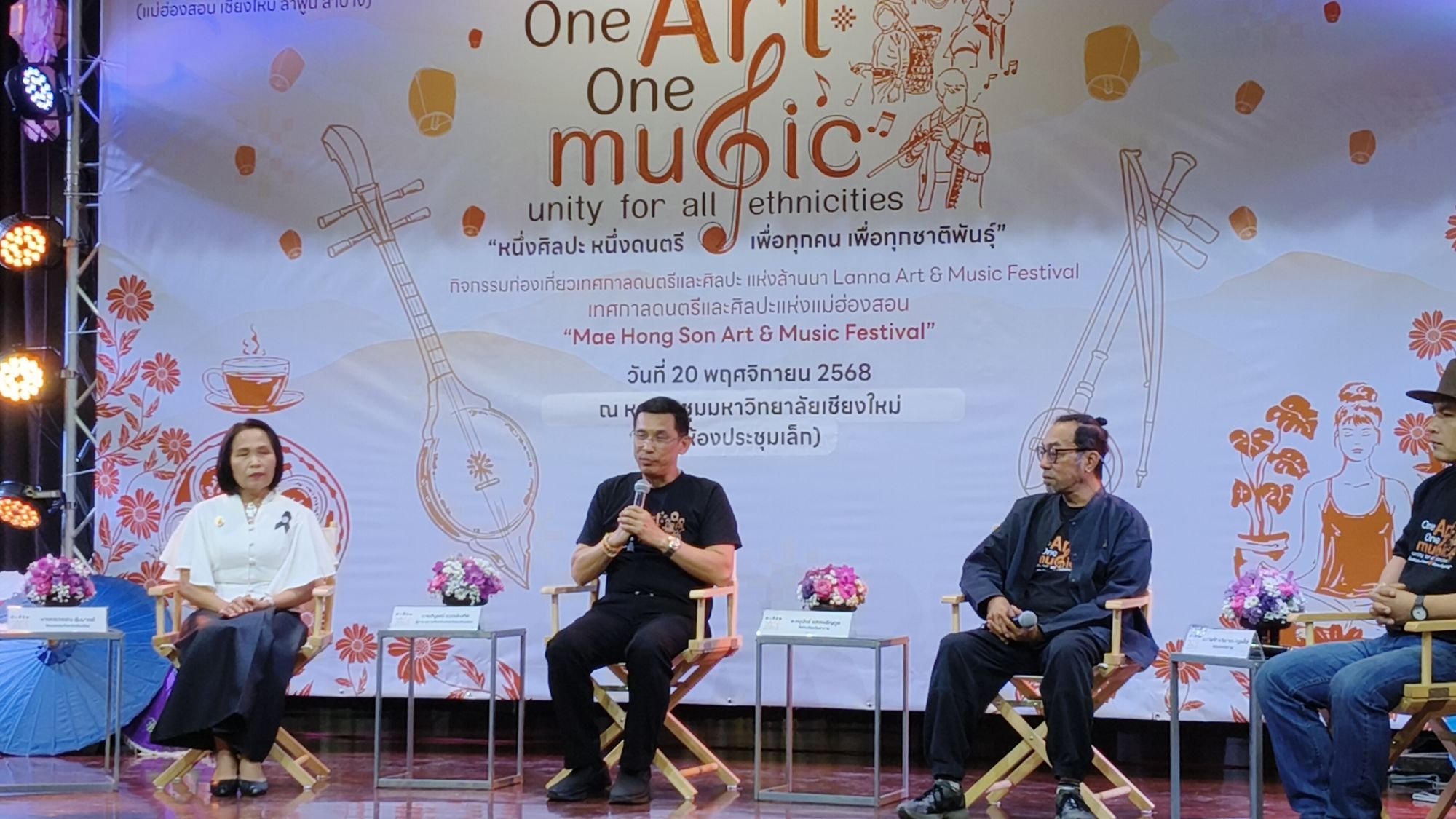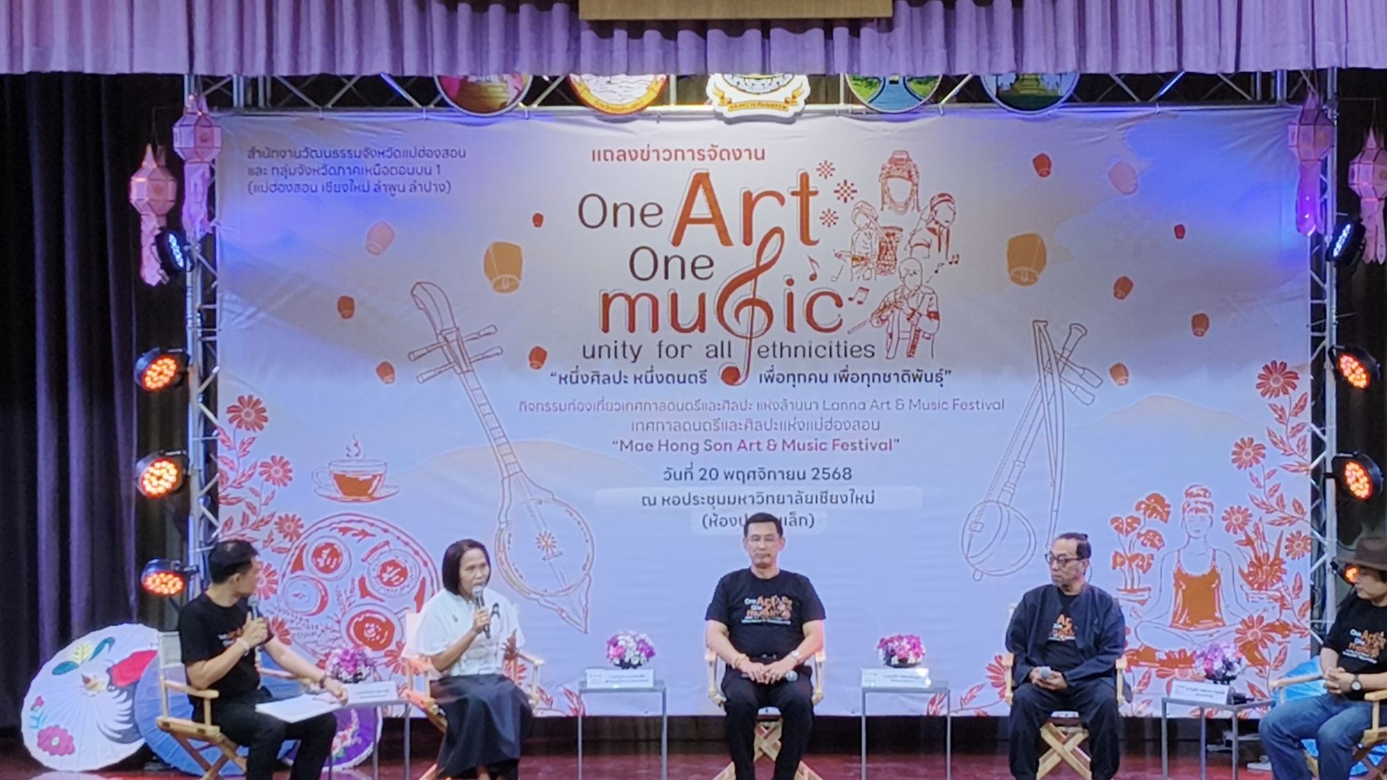 เมื่อวันที่ 20 พ.ย. 68 ที่ห้องประชุมเลประชุมมหาวิทยาลัยเชียงใหม่ จังหวัดเชียงใหม่ นายรัฐพล นราดิศร ผู้ว่าราชการจังหวัดเชียงใหม่ พร้อมด้วย นายวิบูรณ์ แววบัณฑิต ผู้ว่าราชการจังหวัดแม่ฮ่องสอน อาจารย์ภานุทัต อภิชนาธง (ครูแอ๊ด เดอะสะล้อ) ศิลปินจังหวัดลำพูน และนายอนุวัตร์ แสงเจริญกูล ศิลปินจังหวัดลำปาง ร่วมแถลงข่าวเตรียมการจัดงาน “One art, One music – Unity for all Ethnicities หนึ่งศิลปะ หนึ่งดนตรี เพื่อทุกคน เพื่อทุกชาติพันธุ์” จัดโดยสำนักงานวัฒธรรมจังหวัดแม่ฮ่องสอน ร่วมกับ กลุ่มจังหวัดภาคเหนือตอนบน 1 (แม่ฮ่องสอน เชียงใหม่ ลำพูน ลำปาง) งานที่รวบรวมงานศิลปะและดนตรี ผสมผสานความหลากหลายทางวัฒนธรรมของภูมิภาคล้านนาตะวันตก และสะท้อนความงดงามของการอยู่ร่วมกันท่ามกลางความแตกต่างของชาติพันธุ์ กลุ่มจังหวัดภาคเหนือตอนบน 1 เพื่อส่งเสริมการใช้ทุนทางวัฒนธรรมเป็นรากฐานการขับเคลื่อนการท่องเที่ยวกลุ่มจังหวัดภาคเหนือตอนบน 1 สร้างการเชื่อมโยงการท่องเที่ยวเชิงวัฒนธรรมสร้างสรรค์สู่ท้องถิ่น ทั้งยังส่งเสริมการเพิ่มมูลค่าการตลาด มีเวทีสร้างองค์ความรู้และสร้างสรรค์ผลงานขับเคลื่อนเศรษฐกิจ และยกระดับการสร้างมูลค่าแก่สินค้าและบริการทางการท่องเที่ยวเชิงวัฒนธรรมอย่างสร้างสรรค์