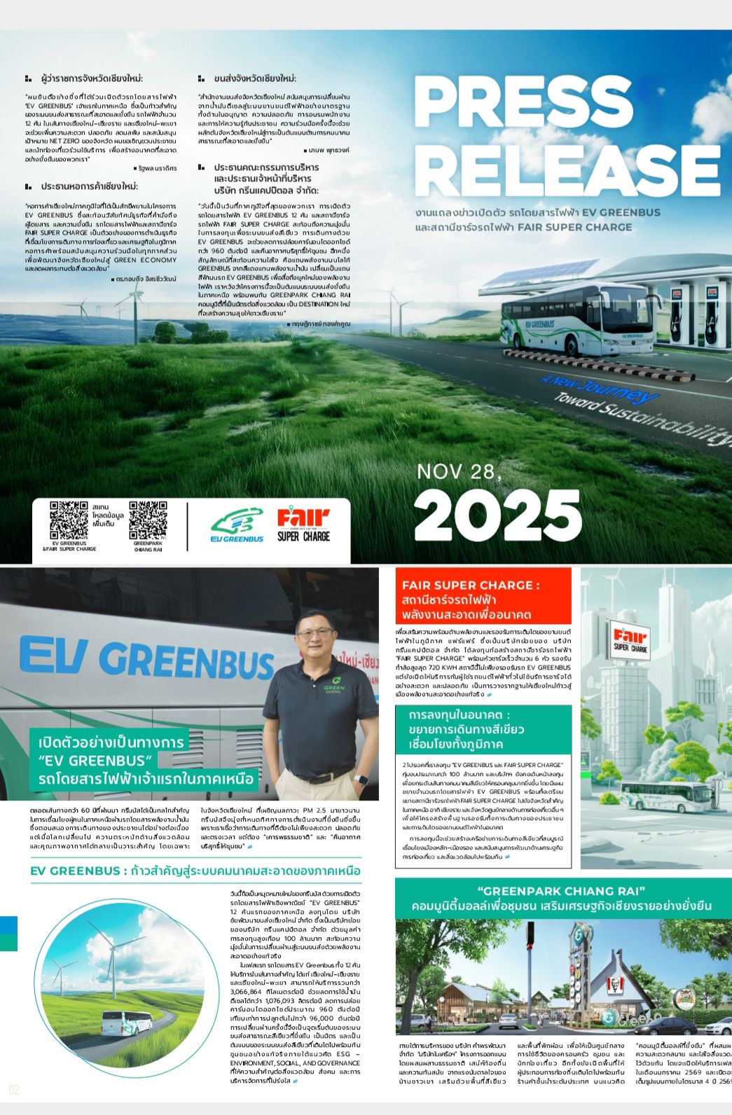 และบริษัทยังมีแผนขยายจำนวนรถโดยสารไฟฟ้า EV GREENBUS และสถานีชาร์จ FAIR SUPER CHARGE ไปยังจังหวัดสำคัญในภาคเหนือ อาทิ เชียงราย และจังหวัดศูนย์กลางด้านการท่องเที่ยวอื่น ๆ ในอนาคต เพื่อสร้างเครือข่ายการเดินทางสีเขียวที่สมบูรณ์แบบ เชื่อมโยงเมืองหลัก-เมืองรอง และสนับสนุนการพัฒนาด้านเศรษฐกิจ การท่องเที่ยว และสิ่งแวดล้อมไปพร้อมกัน นายกฤษฏิภาชย์ฯ กล่าวในตอนท้าย.