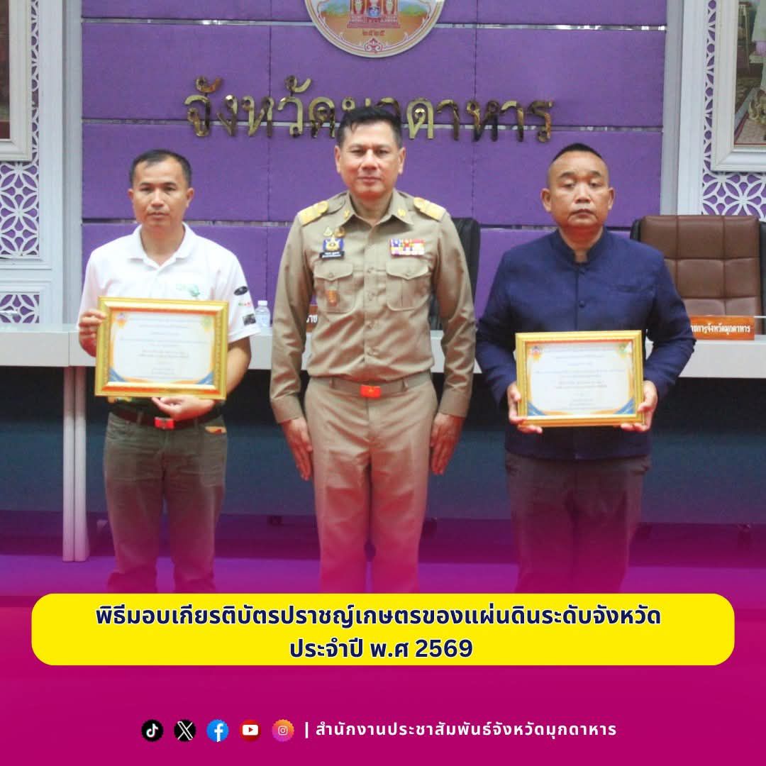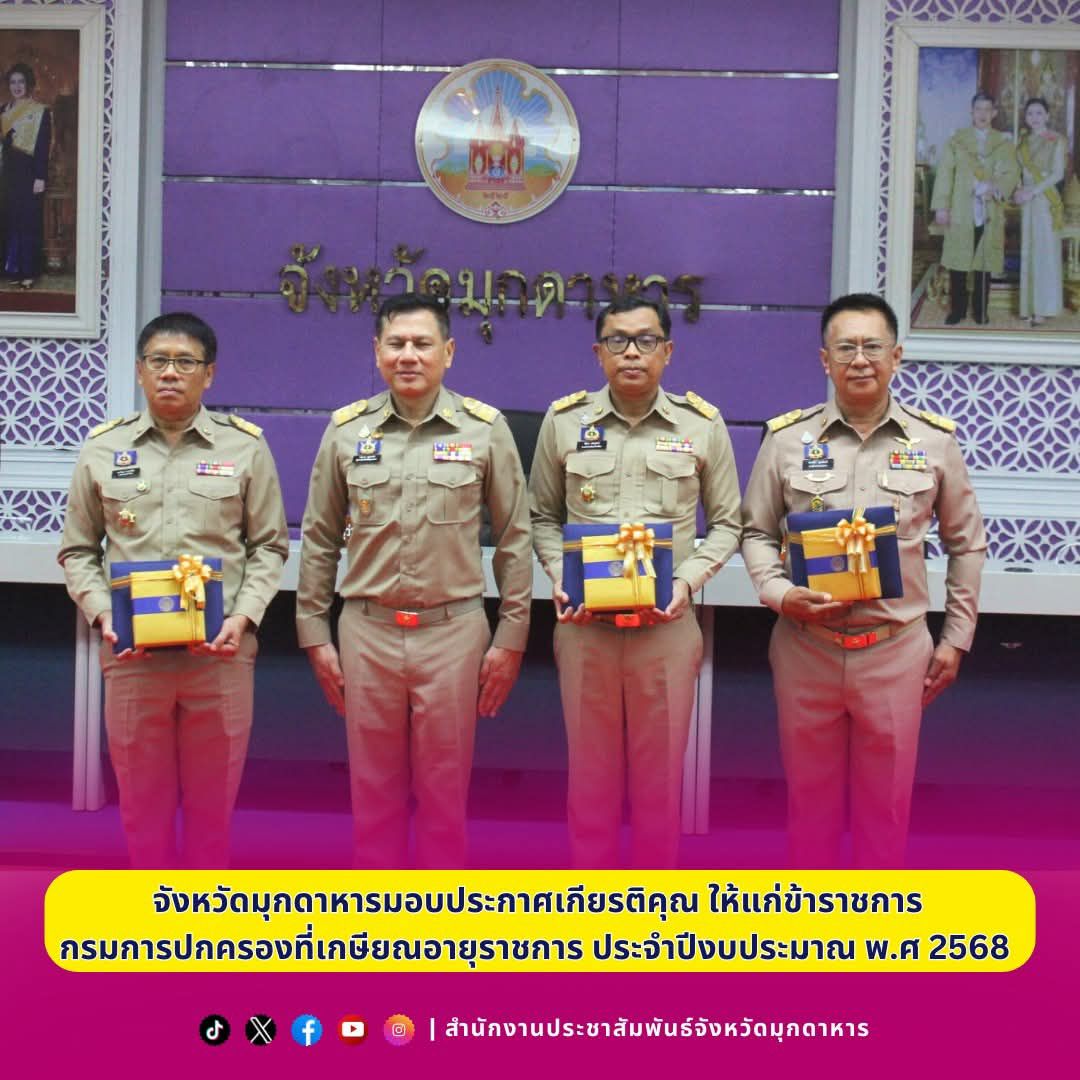 ภายหลังจากการประชุม ผู้ว่าราชการจังหวัดมุกดาหารได้เป็นประธานในพิธีมอบเกียรติบัตรและรางวัลเพื่อเชิดชูเกียรติและสนับสนุนการดำเนินงานในด้านต่าง ๆ ประจำปีงบประมาณ พ.ศ. 2568 และ 2569 ดังนี้