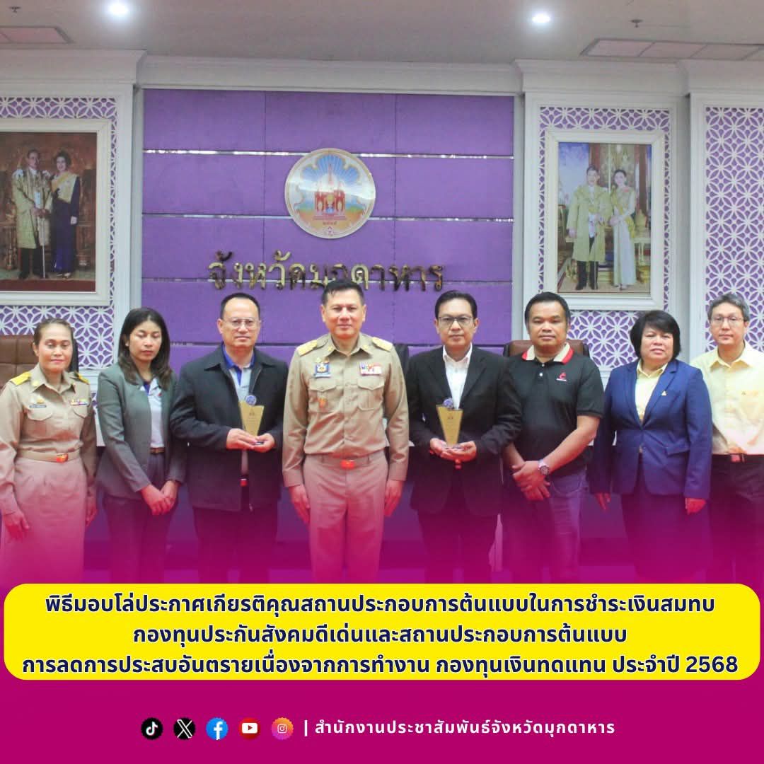 ประกันสังคมและความปลอดภัย: มอบโล่ประกาศเกียรติคุณ สถานประกอบการต้นแบบในการชำระเงินสมทบกองทุนประกันสังคมดีเด่น และ สถานประกอบการต้นแบบการลดการประสบอันตรายเนื่องจากการทำงาน กองทุนเงินทดแทน ประจำปี 2568