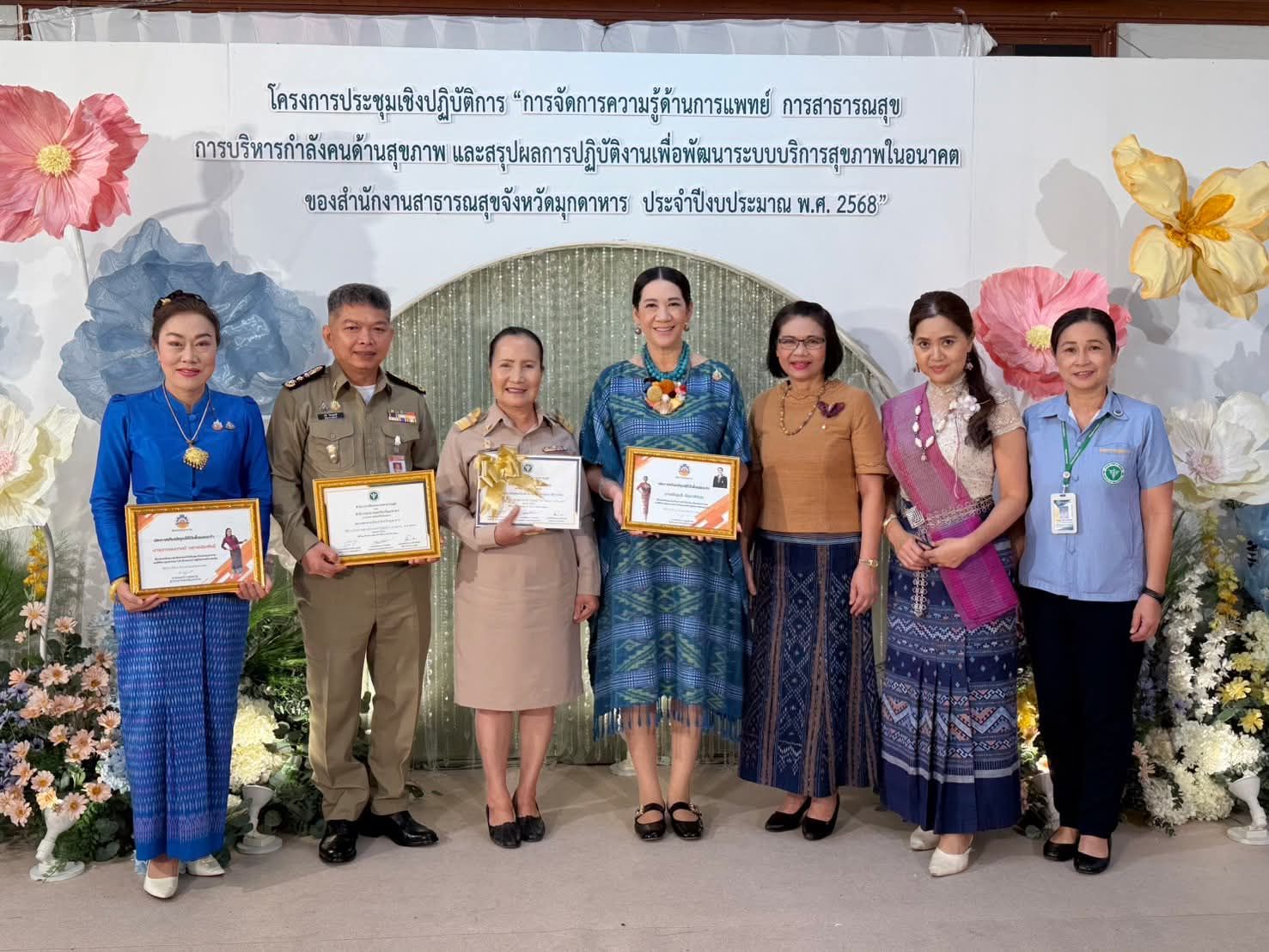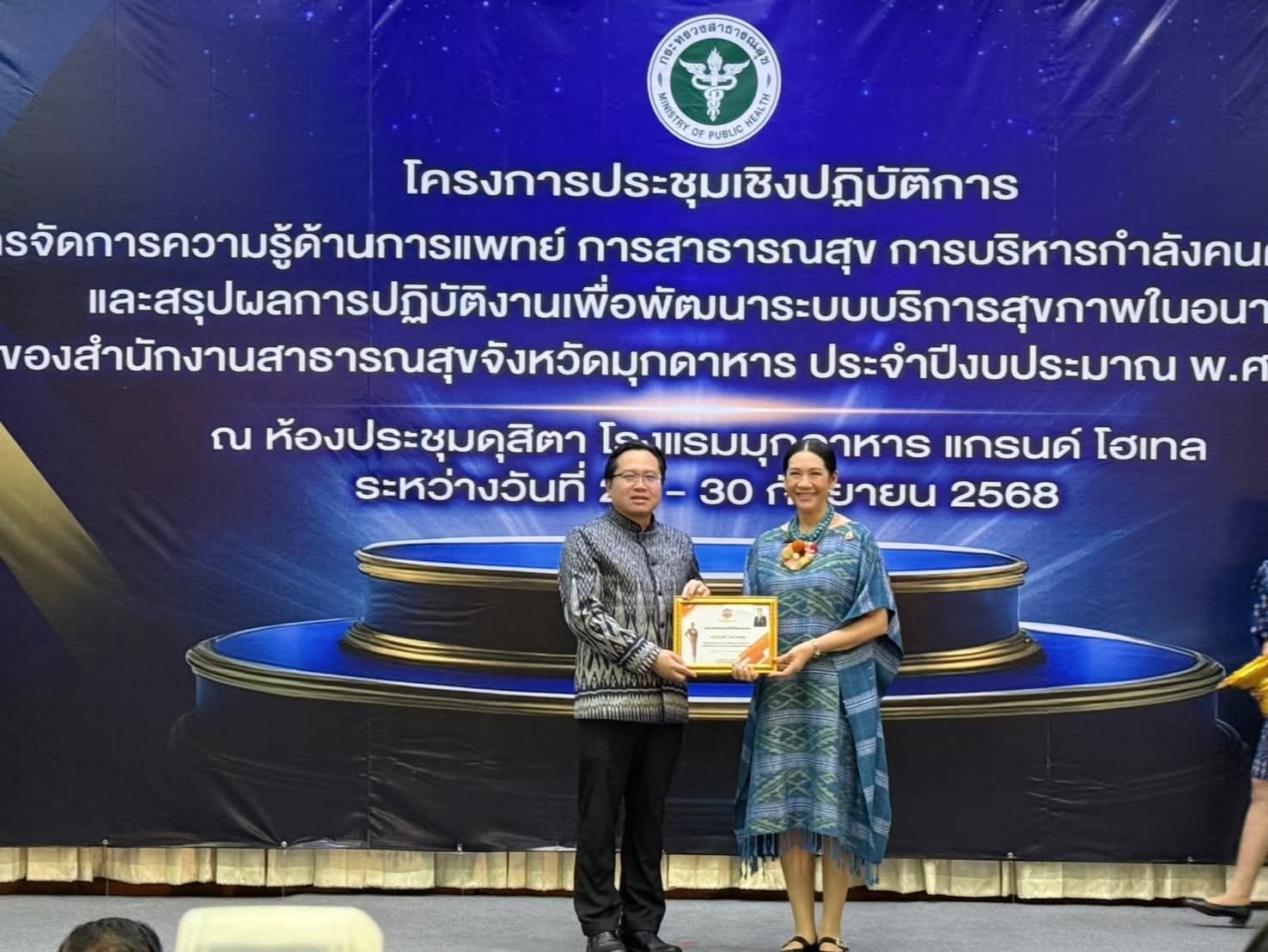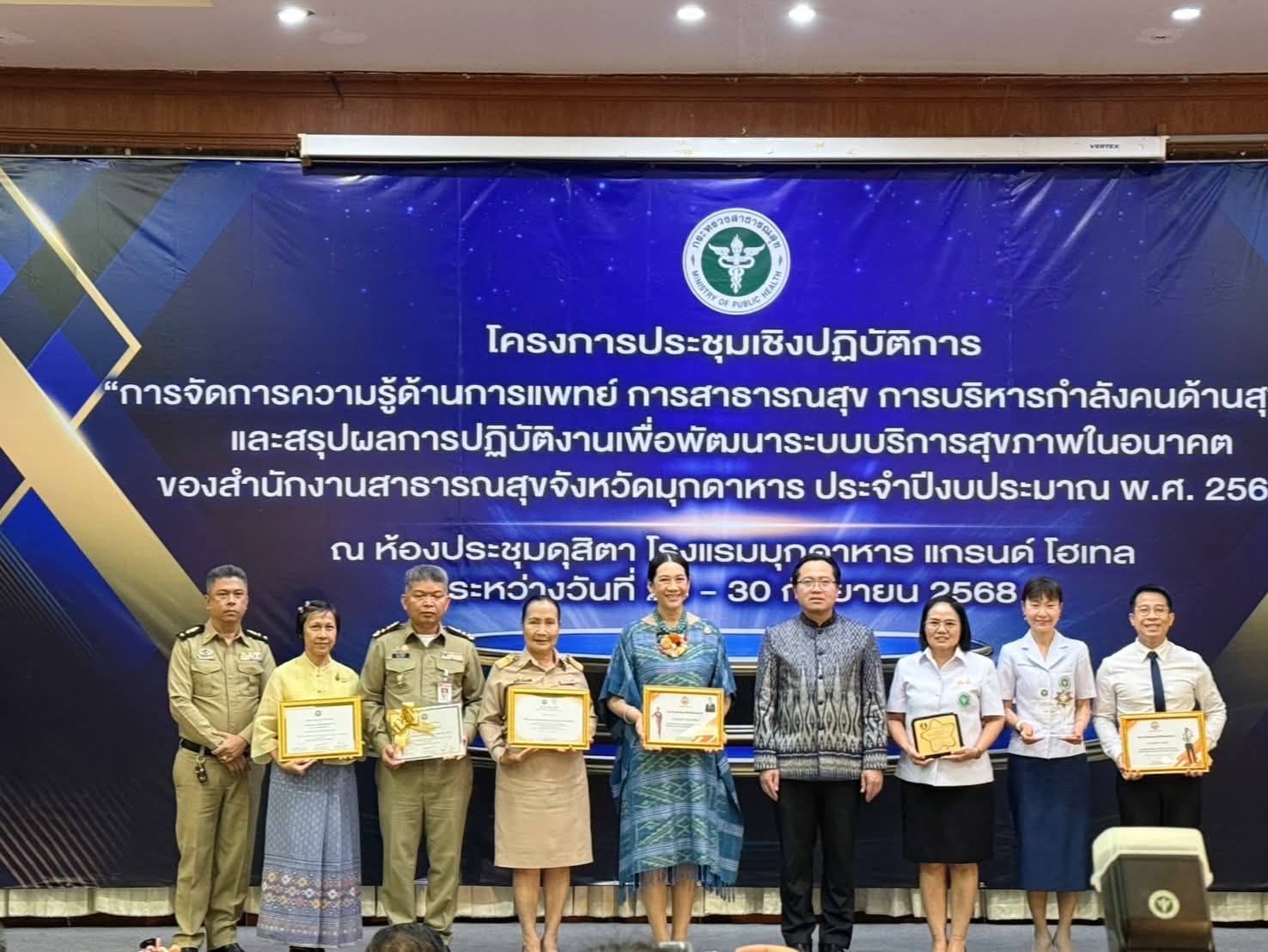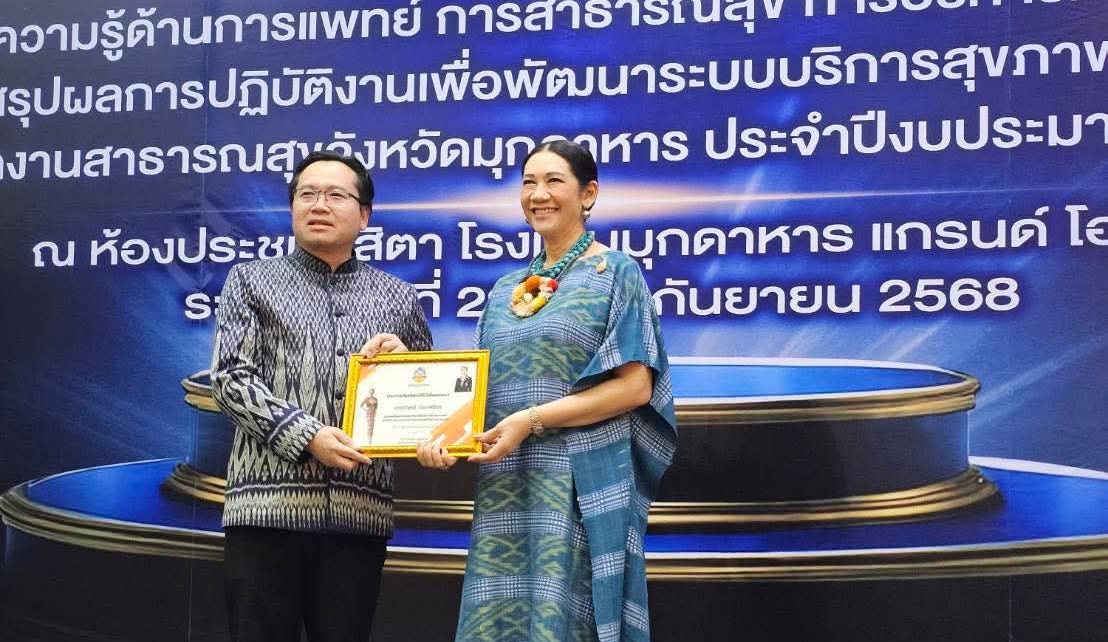 มุกดาหาร – เมื่อวันที่ 29 กันยายน 2568 นางอัญชลี กัลมาพิจิตร ประธานชมรมแม่บ้านมหาดไทยจังหวัดมุกดาหาร เข้ารับมอบรางวัลอันทรงเกียรติจาก นายแพทย์ณรงค์ จันทร์แก้ว นายแพทย์สาธารณสุขจังหวัดมุกดาหาร ณ สำนักงานสาธารณสุขจังหวัดมุกดาหาร